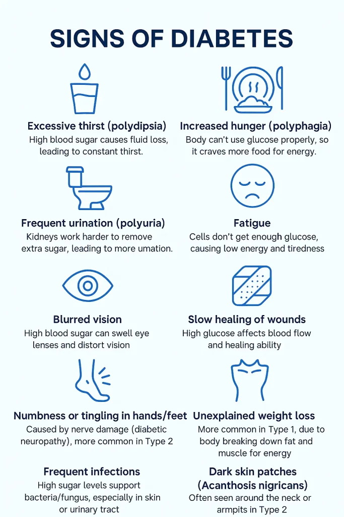 | 🚽 Frequent urination (polyuria) | Kidneys work harder to remove extra sugar, leading to more urination. |